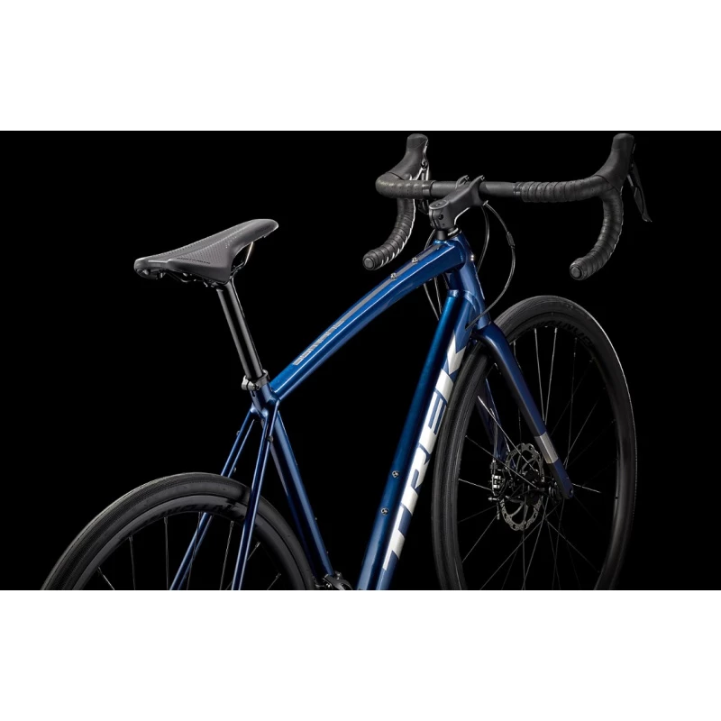 Le cadre en aluminium léger est doté de fixations de garde-boue et d’une fourche en carbone, des caractéristiques qui ne sont généralement pas proposées sur les vélos de route à ce prix. La transmission Shimano propose 16 vitesses avec des changements de vitesse intégrés aux leviers de frein, si bien que les mains ne doivent jamais lâcher le cintre. La large plage de rapports facilite les sorties dans les régions où le dénivelé varie. Sans oublier les solides roues Bontrager, les pneus anti-crevaison et les freins à disque.
